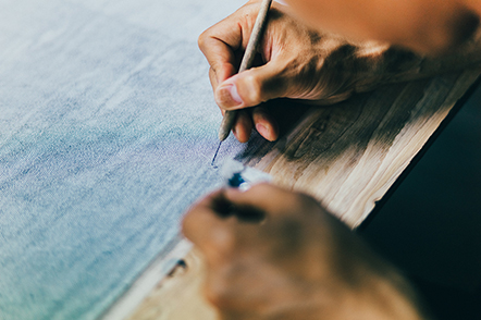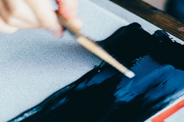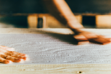 うづくり加工された凹凸のある木板の上で、型染めをしていく作業