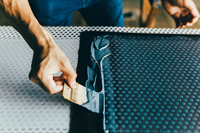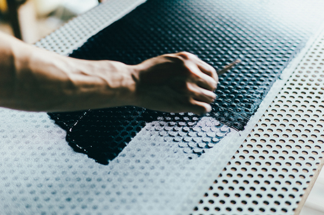 パンチング加工によって穴を開けたアルミ板の上で、型染めをしていく作業