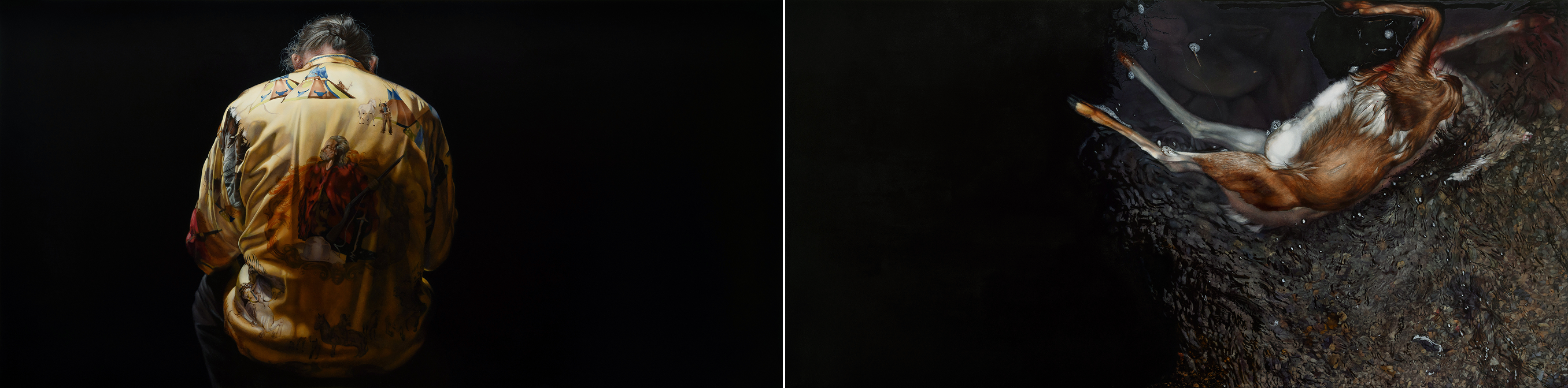 1991年大阪府生まれ。日本を拠点に活動。自身の複雑な生い立ちや抗い難い境遇と向き合い、そこに生じる矛盾や葛藤を絵画として昇華させる。極めてパーソナルな体験を起点としながらも、生と死、愛と憎しみ、貧富といった表裏一体の感情を、人間社会の縮図ともいえる普遍的なテーマへと拡張する点に特徴がある。遊郭街の裏でハイブランドを扱うブティックを営む家庭に育ち、その二重性は制作の重要な原風景となっている。学生時代より取り組む〈Leisure Class(有閑階級)〉シリーズでは、豪奢な柄のシルクシャツを纏う祖父を描き、顕示欲の背後に潜む体裁と内実の乖離を可視化した。父親の孤独死を契機に始まった〈Single Bed〉シリーズは、実際のシングルベッドと同寸で描かれ、複雑な愛憎関係や社会的断絶を静かに映し出す代表作となっている。描かれるモチーフは多岐にわたるが、作品には常にメメント・モリの思想が横たわり、個人のアイデンティティとその拠り所を問い続ける。近年はカトリック教会での学びを背景に、罪と贖罪、宗教と美、権力の構造といったより根源的な主題へと関心を深める。時に自作の詩を添えることで鑑賞者の記憶と交錯させ、内面的なカタルシスを喚起する表現へと深化している。国内ではギャラリー小柳などで個展を開催し、複数のグループ展にも参加するなど、活動の幅を広げている。